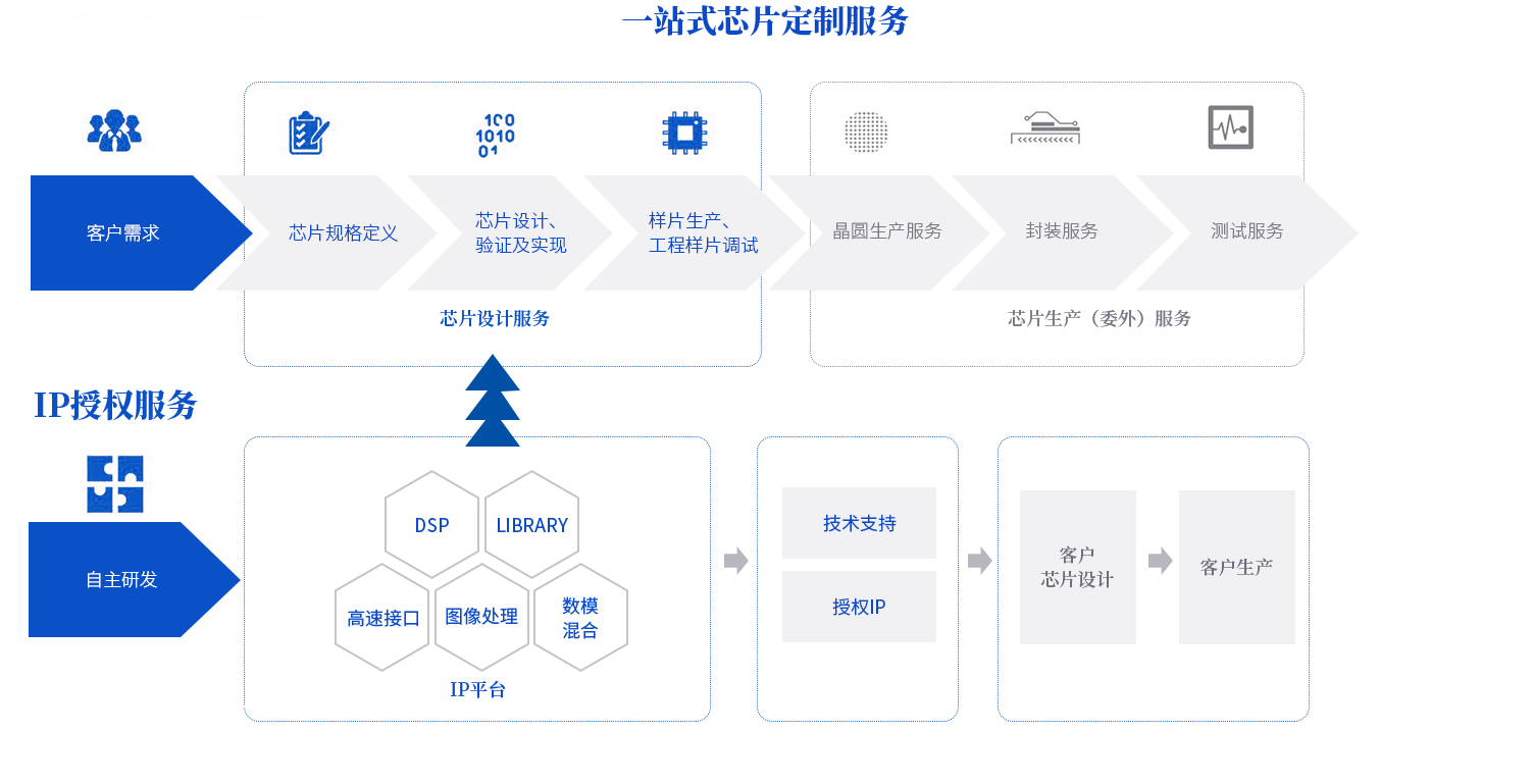 融创微致力于为客户提供从芯片定义到设计流片的全流程服务,包括:芯片架构定义、IP选型、前端设计、DFT、验证、物理设计、版图、流片、封装和测试服务等。 同时,融创微还可以帮助客户委外完成晶圆制造、封装和测试等,提供Turn-key一站式服务。